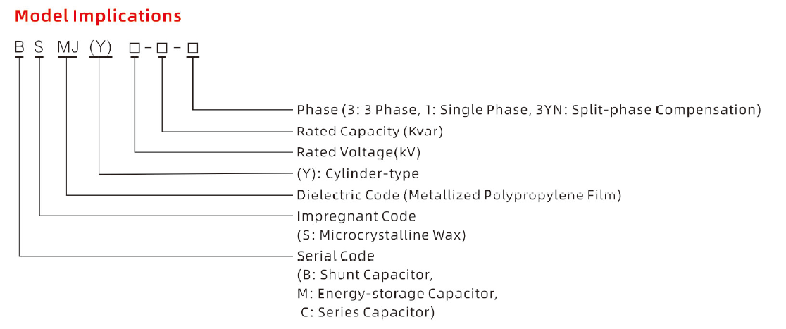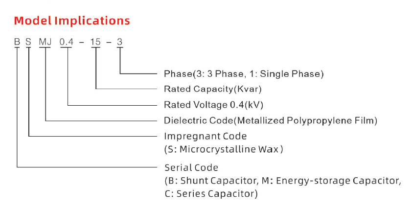 প্রথম অক্ষর B "শান্ট ক্যাপাসিটর" প্রতিনিধিত্ব করে, যা নির্দেশ করে যে ক্যাপাসিটরটি পাওয়ার সিস্টেমে সমান্তরালভাবে সংযুক্ত রয়েছে, প্রাথমিকভাবে প্রতিক্রিয়াশীল শক্তি ক্ষতিপূরণের জন্য; দ্বিতীয় অক্ষর S নির্দেশ করে যে গর্ভধারণকারী মাধ্যমটি হল "প্যারাফিন মোম" বা "মাইক্রোক্রিস্টালাইন মোম," একটি স্থিতিশীল এবং পরিবেশ বান্ধব গর্ভধারণকারী এজেন্ট যা কার্যকরভাবে ক্যাপাসিটরের প্রতিরোধ ভোল্টেজ এবং তাপ অপচয়ের কার্যকারিতা উন্নত করে; এবং তৃতীয় এবং পরবর্তী অক্ষর MJ "মেটালাইজড পলিপ্রোপিলিন ফিল্ম", ক্যাপাসিটরের ইন্টার-ইলেক্ট্রোড ডাইলেক্ট্রিকের জন্য একটি মূল উপাদান, স্ব-নিরাময় বৈশিষ্ট্যের অধিকারী এবং স্থানীয় ভাঙ্গন ঘটলে স্বয়ংক্রিয়ভাবে নিরোধক পুনরুদ্ধার করে।